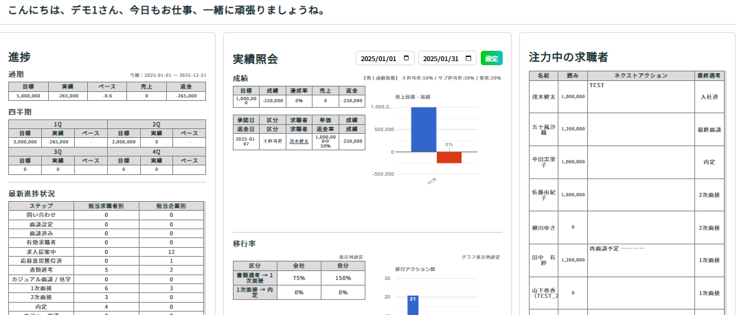 全社の売上の状況や、KPIの進捗状況を確認することができます。 KPIを取りたい選考フローやダッシュボードに表示したい項目の種類などについては 事業に応じたカスタマイズが可能になっています。