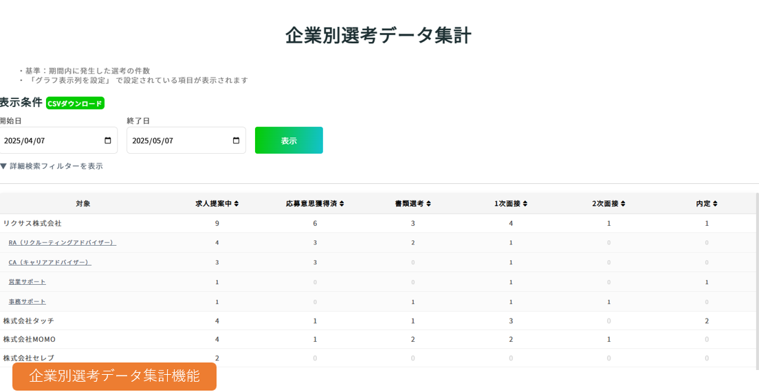 求職者・企業・求人・選考データについて、CSVでの出力が可能です。