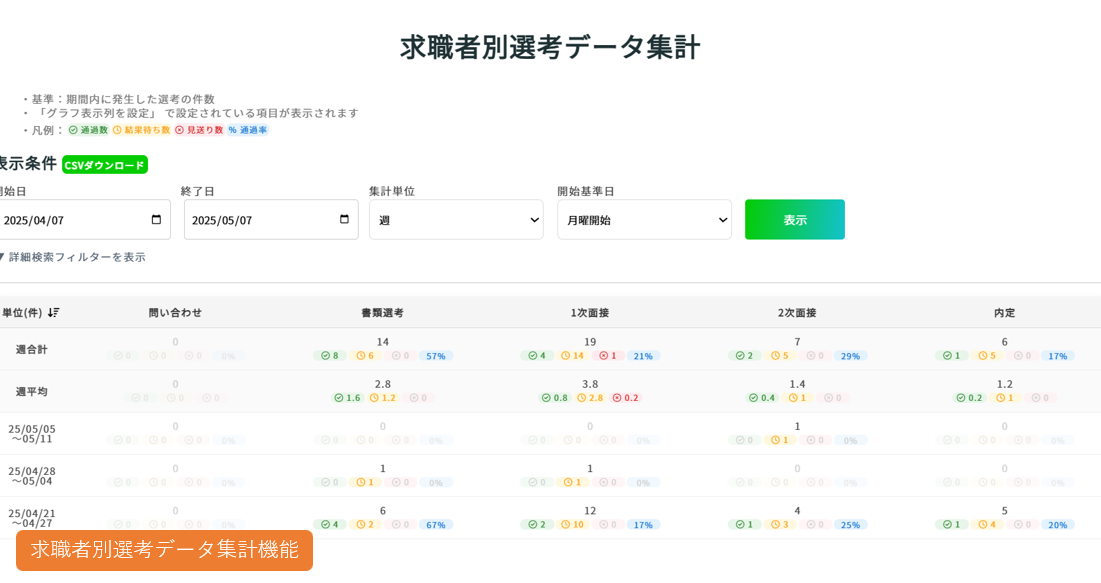 各フェーズにおける、担当者ごとの選考通過率を自動計算することが可能です。
