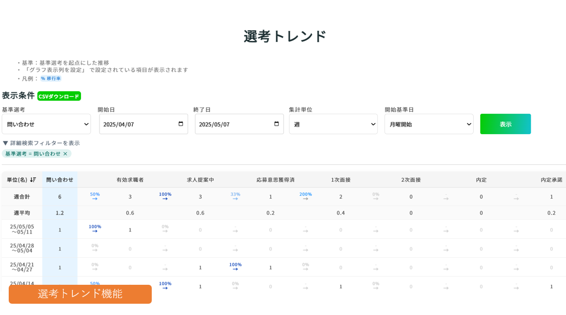 例えば、「書類選考まで進んだ進捗がその後、どのような推移を辿ったか」といった 各選考データの推移の詳細をご確認いただくことが可能です。