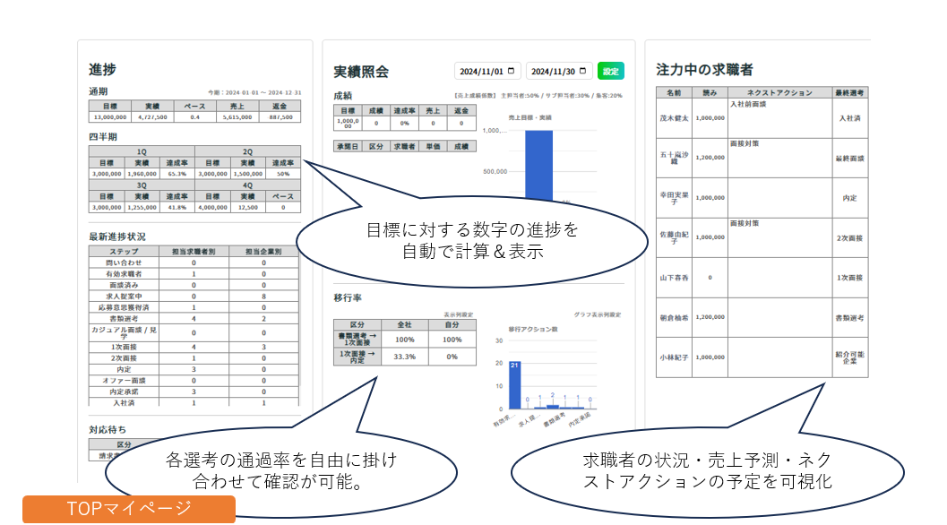 人材紹介業で業務フローの改善を図る際には、どの部分に課題があるのか、という点を可視化するためのシステムが必要です。