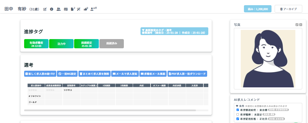 求職者ごとにアクションログ(対応履歴)を蓄積することができます。 合わせて、ネクストアクションの設定も可能です。 ネクストアクションについては、対応担当者・期日を設けて設定することができます。