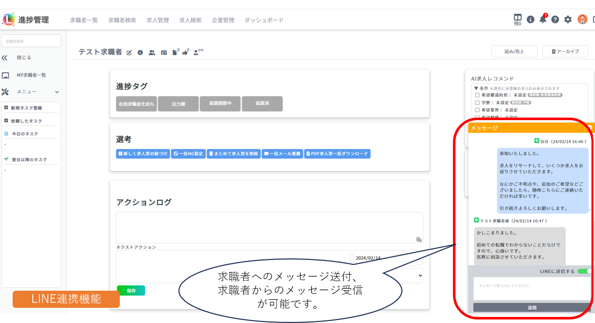 LaS上から直接、求職者とLINEメッセージのやり取りをすることが可能です。