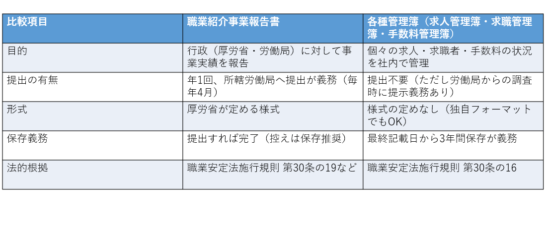 職業紹介事業報告書と各種管理簿(求職管理簿、求人管理簿、手数料管理簿)はどちらも職業紹介事業者が行う書類管理ですが、目的・内容・提出先の有無が全く異なります。