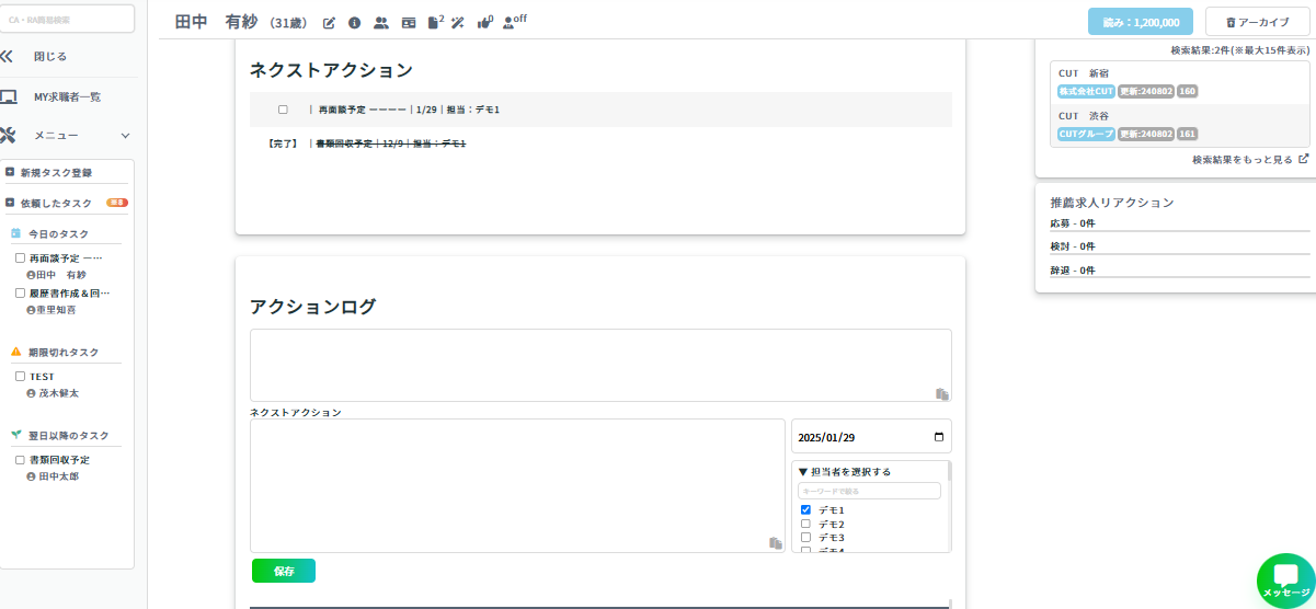 管理者IDでは、社内全員に課されているタスクの内容と、その処理状況を一覧画面で確認することができます。 メンバーそれぞれに課されているタスクの状況が分かるため、 人材紹介業でブラックボックス化しがちな各担当者の業務状況について、 管理者目線で把握することが可能です。
