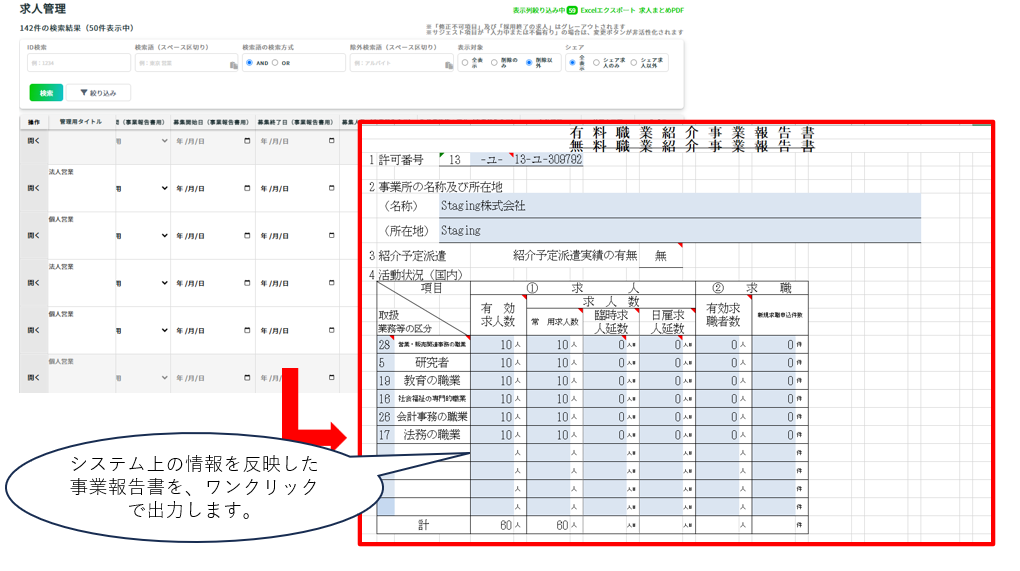 人材紹介事業システム『LaS』では、上記のような煩雑な作業を減らすため 管理している情報に合わせて、ワンクリックで必要な情報がエクスポートできるように なっております。