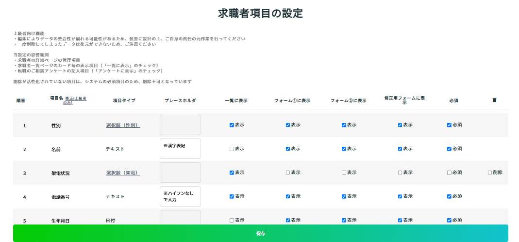 求人票に表示する項目名や並び順・グルーピングを設定していただけます。