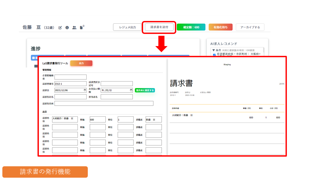 求人企業に対して、求職者の成約時、紹介手数料を請求する際に発行します。