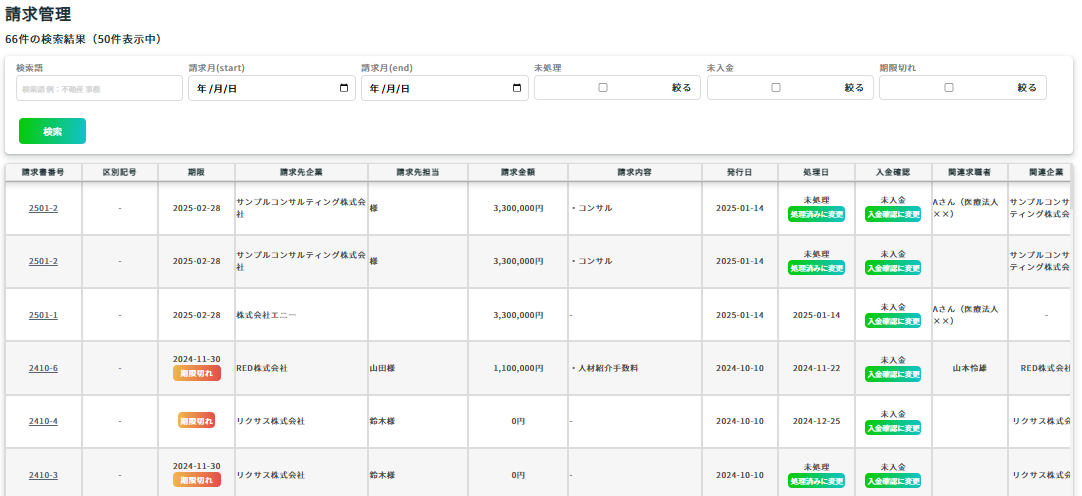 発行した請求書の情報が自動で蓄積されていきます。 入金確認機能も設けておりますので、請求書発行→送付→入金確認の一連のフローを管理・確認することが可能です。